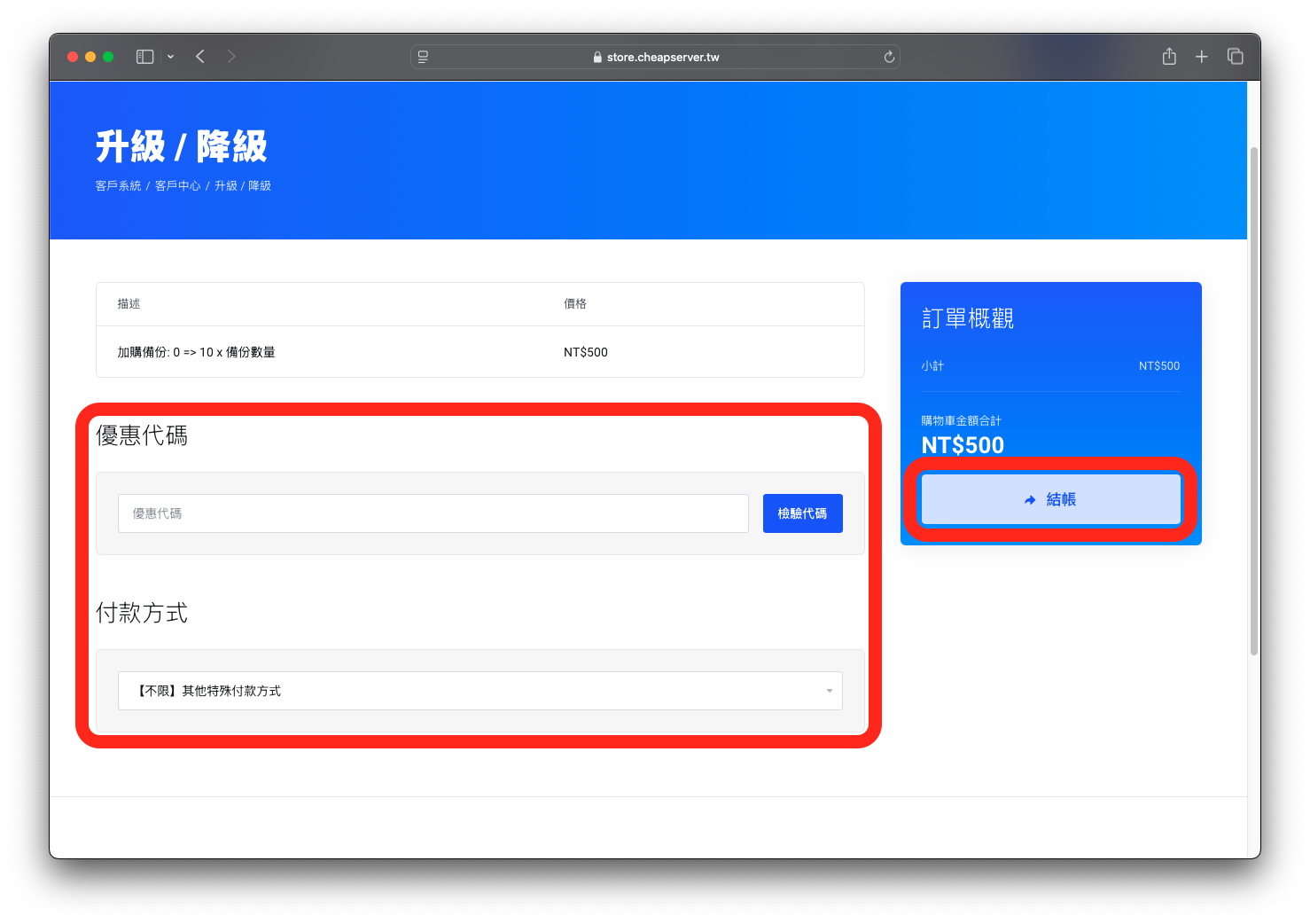 5. 確認付款金額與付款方式。如果你有優惠代碼，則可以在欄位內填入。最後點擊 「結帳」。