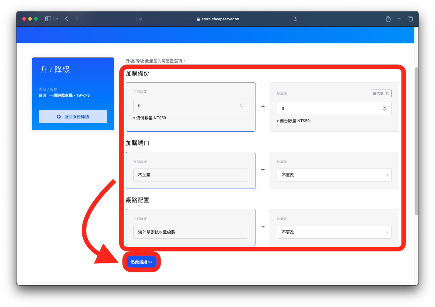 4. 進入頁面後，你就會看到你可以調整升級的選項。選擇好後，點擊 「點此繼續 >>」 按鈕。